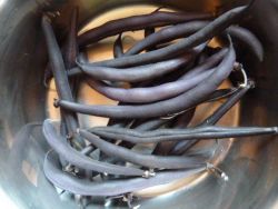 In dieser Woche ernten wir Blaue Buschbohnen aus unserem Zuchtprogramm für Kultursaat e.V.. Wir kultivieren verschiedene Stämme auf Frühzeitigkeit und Einheitlichkeit. Die blauen Bohnen werden beim Kochen grün, sie verlieren dabei ihren roten Farbstoff, und können wie grüne Bohnen zubereitet werden.