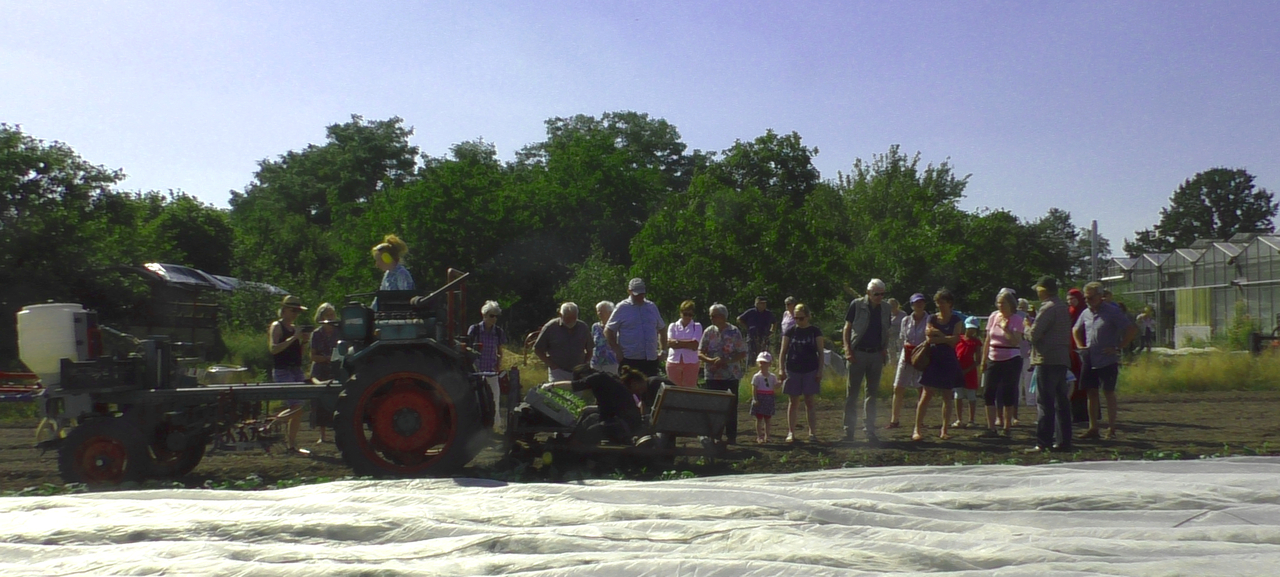 Die Gärtner führten eine Spitzkohlpflanzung von Hand vor und zum Vergleich, mit der Pflanzmaschine. Wobei sich herausgestellt hat, dass die Pflanzung mit der Maschine regelmäßiger ist. Trotz Pflanzmaschine sind natürlich Gärtner im Einsatz. Die Pflanzen werden einzeln von Hand in die Pflanzmaschine gelegt und so in den Boden eingesetzt.
