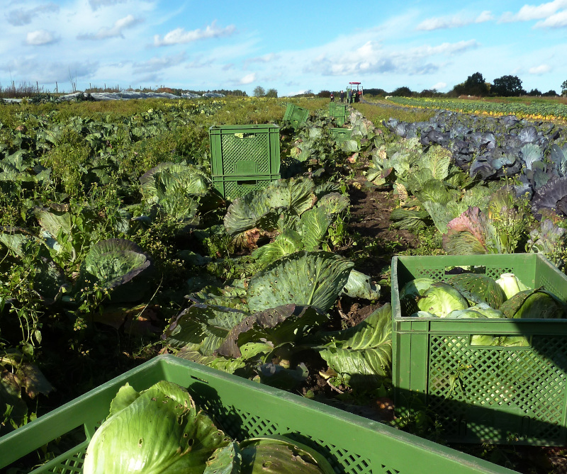 Unsere Kohlernte ist in vollem Gange. In die neuen Kühlräume können wir dieses Jahr deutlich mehr einlagern. Der Kohl hat sich auch recht gut entwickelt trotz Kohldrehherzfliege, Kohlfliege, Kohlweißling und all der anderen Freunde der Kreuzblütler. Die Kulturschutznetze konnten dem großen Druck kaum standgehalten. Der intensive großflächige Rapsanbau in unserer Gegend fördert die Entwicklung von gewaltigen hungrigen Populationen von Kohlinsekten. Unsere kleinen Bioflächen sind dem manchmal kaum gewachsen.