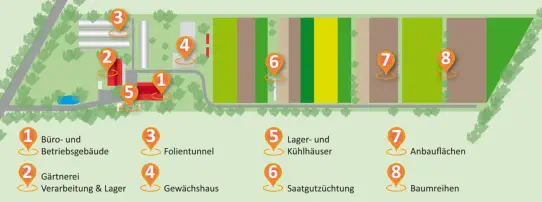 Auf 7,5 ha Freilandfläche und 2.000 qm Gewächshaus- und Folientunnelfläche werden über 40 verschiedene Gemüsearten angebaut. Im Freiland u.a. Kürbisse, Möhren, Pastinaken, Rote Beete, Zwiebeln, Porree, Mangold, Kohlrabi, Buschbohnen, verschiedene Salate und Zucchini; im geschützten Anbau u.a. Tomaten, Gurken, Paprika, Frühporree, Salat, Feldsalat.