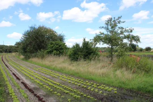 Baumreihen, Hecken und Gründungen sind für uns wichtige Landschaftselemente: Sie verbessern das Kleinklima - bremsen den Wind, spenden Schatten, geben durch Verdunstung Wasser an die Umgebung ab und wirken dadurch kühlend, erhöhen die Biodiversität, bieten Nahrung und Schutz für Insekten, Vögel und andere Kleintiere und fördern das Bodenleben. Nachdem unsere Hecke am Kronacker schon gut gewachsen und somit nun deutlich zu sehen ist, haben wir auch am Buhlenbrock eine Hecke und einen Baumstreifen gepflanzt.