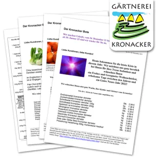 Wöchentlich geben wir einen Newsletter „Der Kronacker-Boten“ heraus. Er enthält Informationen zum wöchentlichen Angebot/Produktinformationen sowie Rezeptvorschläge und unser Monatsangebot. Hier können Sie sich eintragen um den Newsletter zu erhalten.