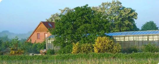 Blick auf das Gewächshaus, dahinter das Betriebsgebäude