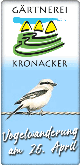 Regional ist unsere Wahl 24. März 2026 7. April 2026 Ich weiß, zur Vogelwanderung muss man früh aufstehen und das am Sonntag (wir starten um 7:00 Uhr bei der Gärtnerei Kronacker). Aber: Es lohnt sich! Die Natur am frühen Morgen hat einen ganz besonderen Zauber an sich und der allein lohnt schon, die Mühen des frühen Aufstehens zu überwinden. Und obendrauf kommen gratis dazu die wunderbaren Vogelstimmen. Ein perfekter Start in den Sonntag. Wussten Sie, dass 6 Minuten Vogelgesang ausreichen, um für einen Tag ausreichend mit Glückshormonen versorgt zu sein? Also: „Raus aus den Federn“. Wir freuen uns auf Sie!                        Beitrag 2025 lesen Vogelwanderung am 26. April