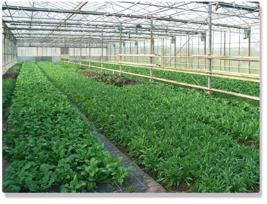 Blick auf das Gewächshaus, dahinter das Betriebsgebäude